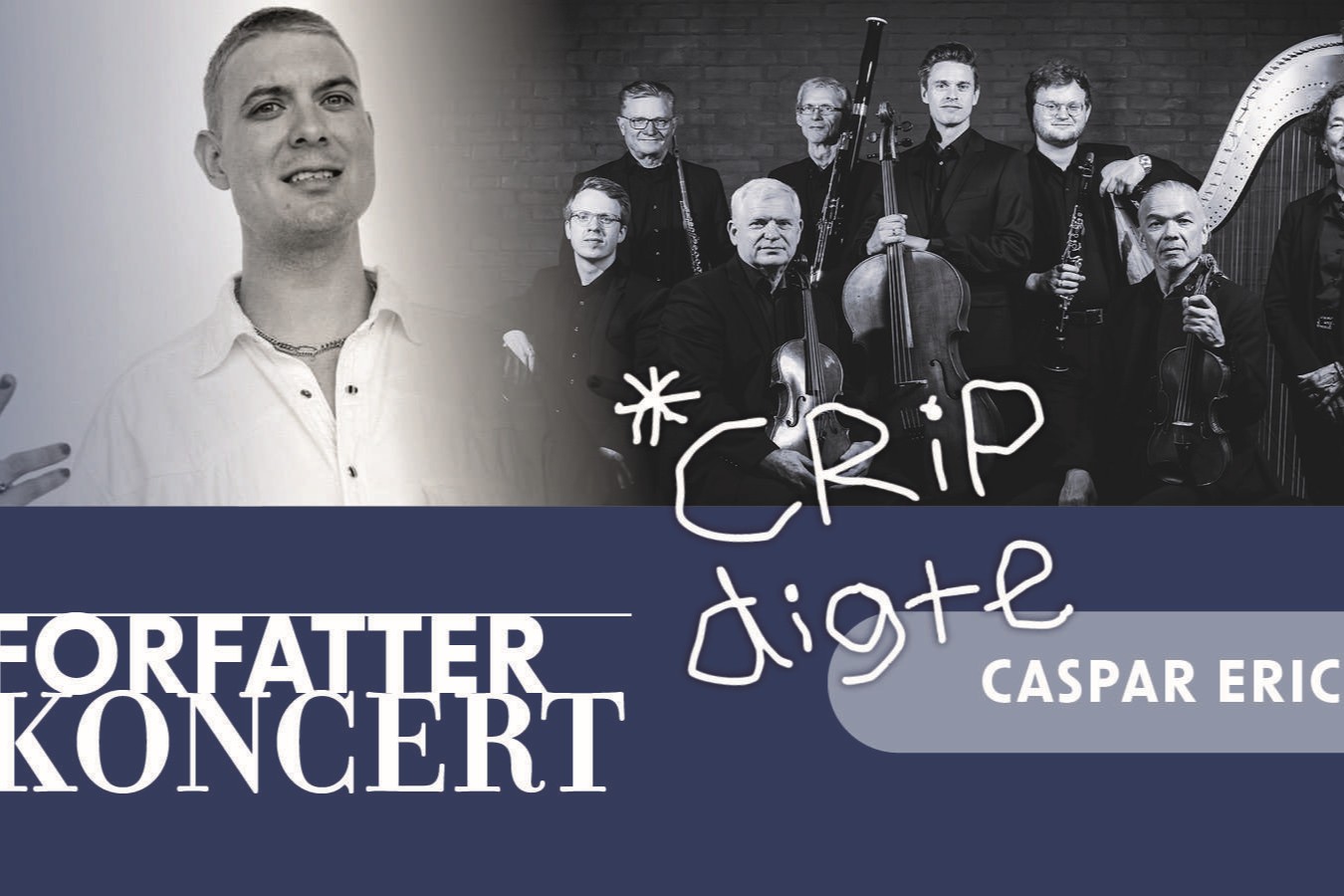 Caspar Eric har med sine digtsamlinger tegnet markante generationsportrætter, der med en nøgtern og personlig stemme sætter fokus på samtidens samfund og livsvilkår. Til denne forfatterkoncert læser han op af sin seneste digtsamling Crip (2025). Musikalske indslag kommenterer ind imellem teksterne, og giver en pause til at lade dem bundfalde sig.