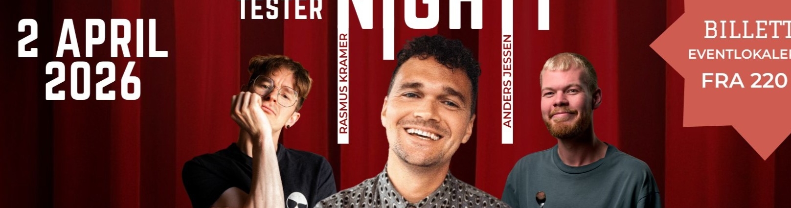 Den 2. april inviterer Eventlokalet til en intim comedy-aften på Omøvej 6A i Næstved med et stærkt line-up: Ruben Søltoft, Rasmus Kramer og Anders Jessen.