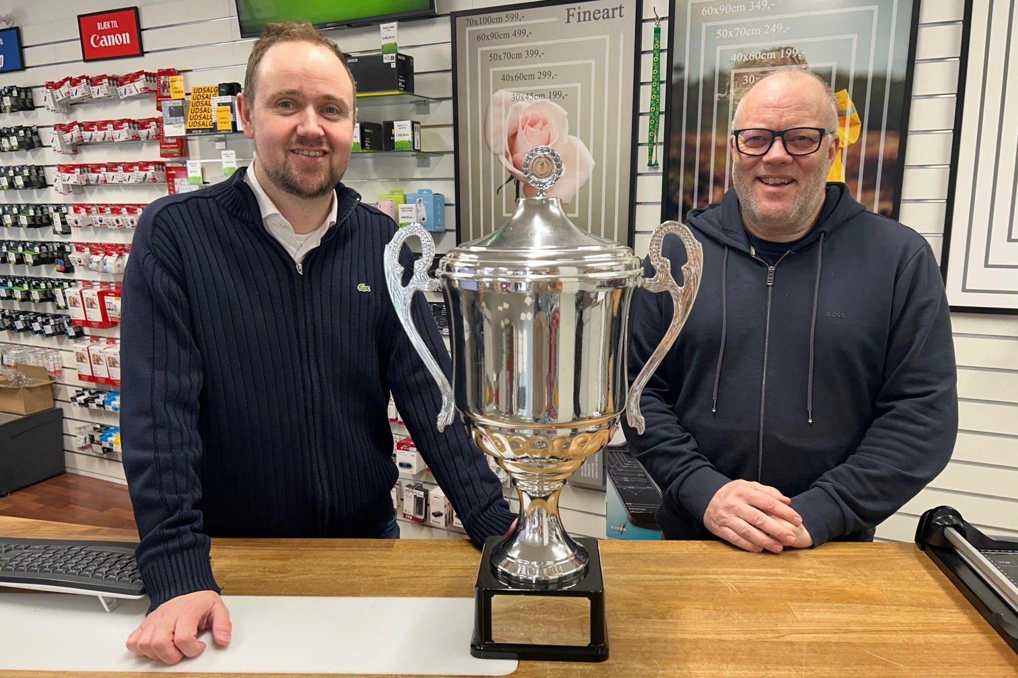 René Kongsgaard og Lars Lindeholm med cityforeningens store vandrepokal. Foto: John Ringstrøm