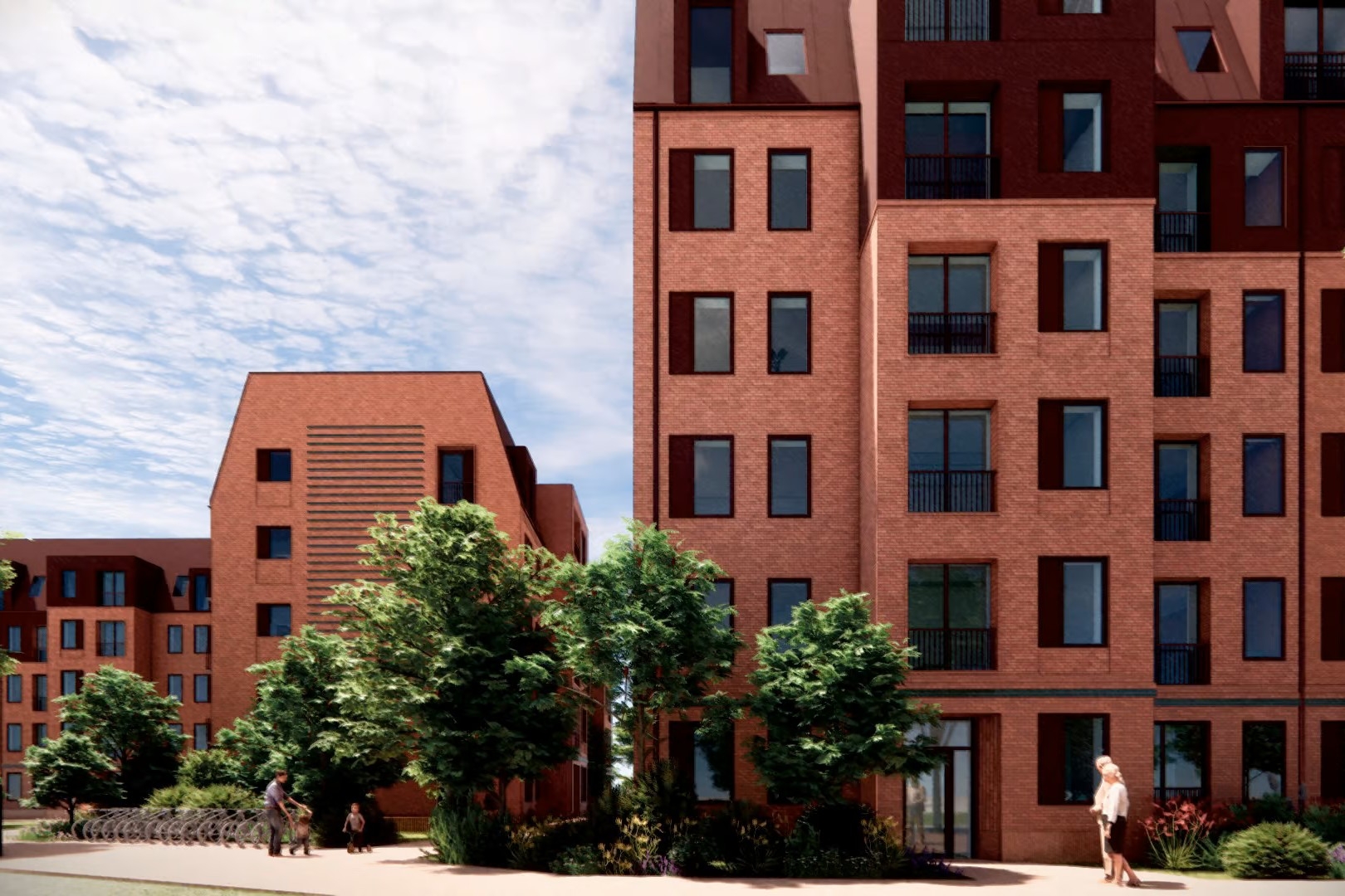 De røde og brune farver bliver gennemgående på hotellets tegl og facade, den urbane, åbne park har fokus på biodiversitet og bæredygtighed, og de 140 henholdsvis ejer- og lejeboliger i samme stil og forskellige størrelser får alle altan eller terrasse og adgang til elevator.
