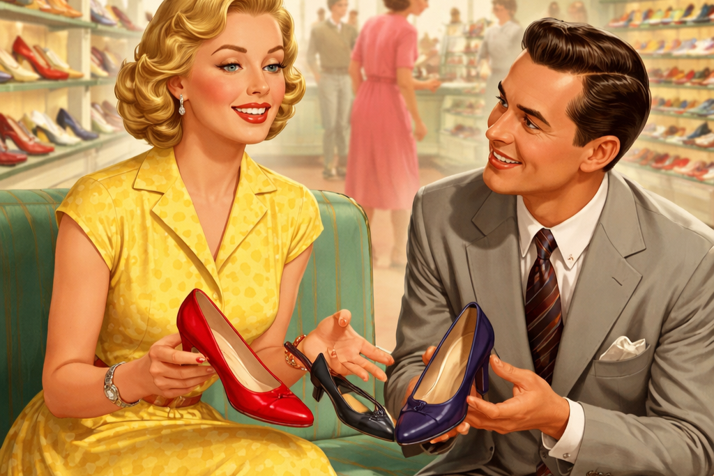 Journalisten kiggede, som om han havde misset en side i regnskabet, og bad om en forklaring. Skosælgeren fortalte, at han igen og igen havde set det samme mønster. En kvinde prøver et par sko. Så et par mere. Så får hun øje på et tredje par.
